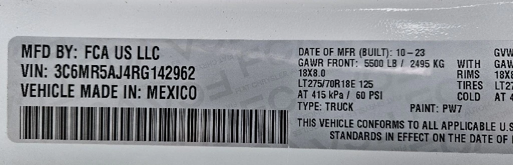 | VIN #: | 3C6MR5AJ4RG142962 |