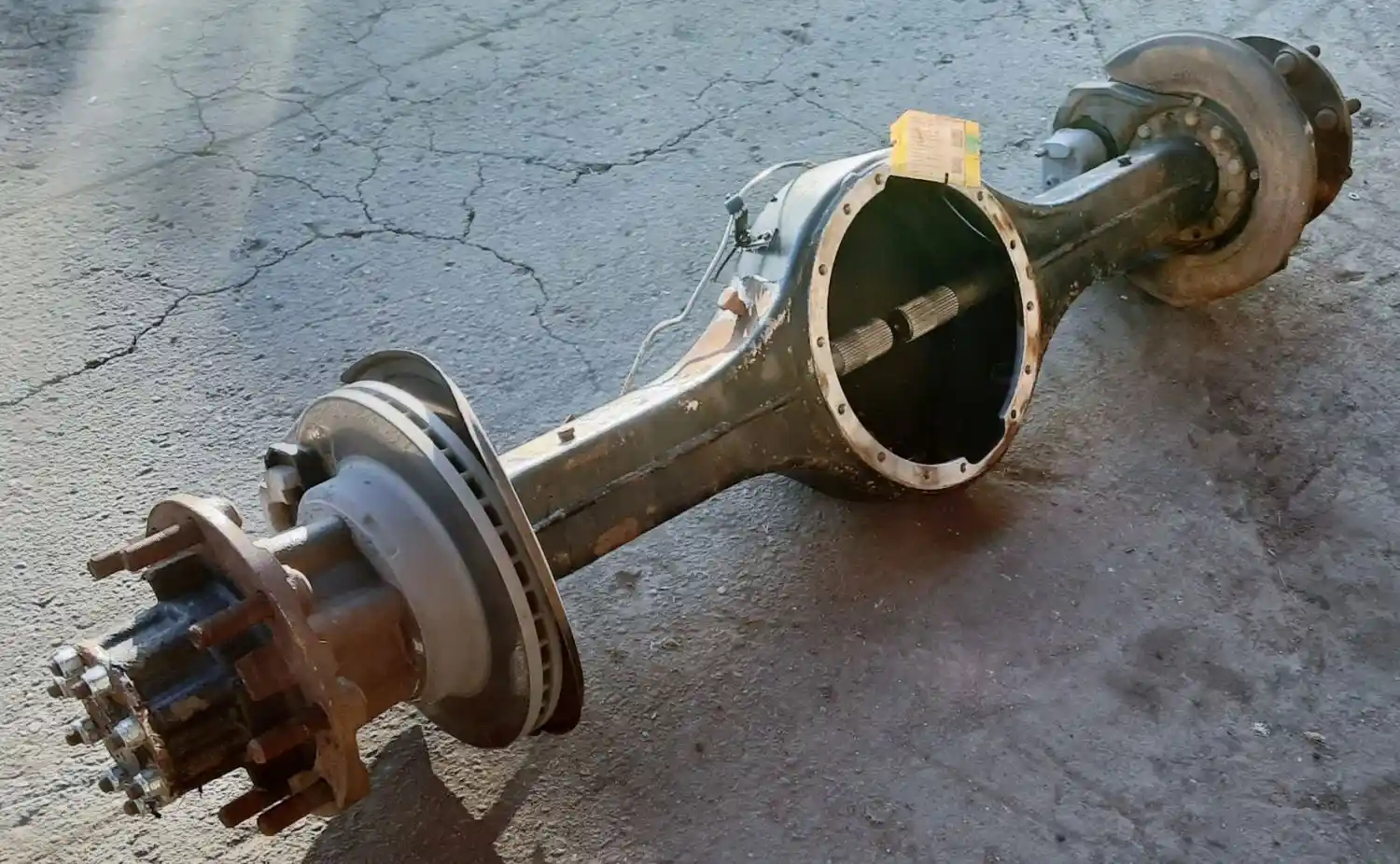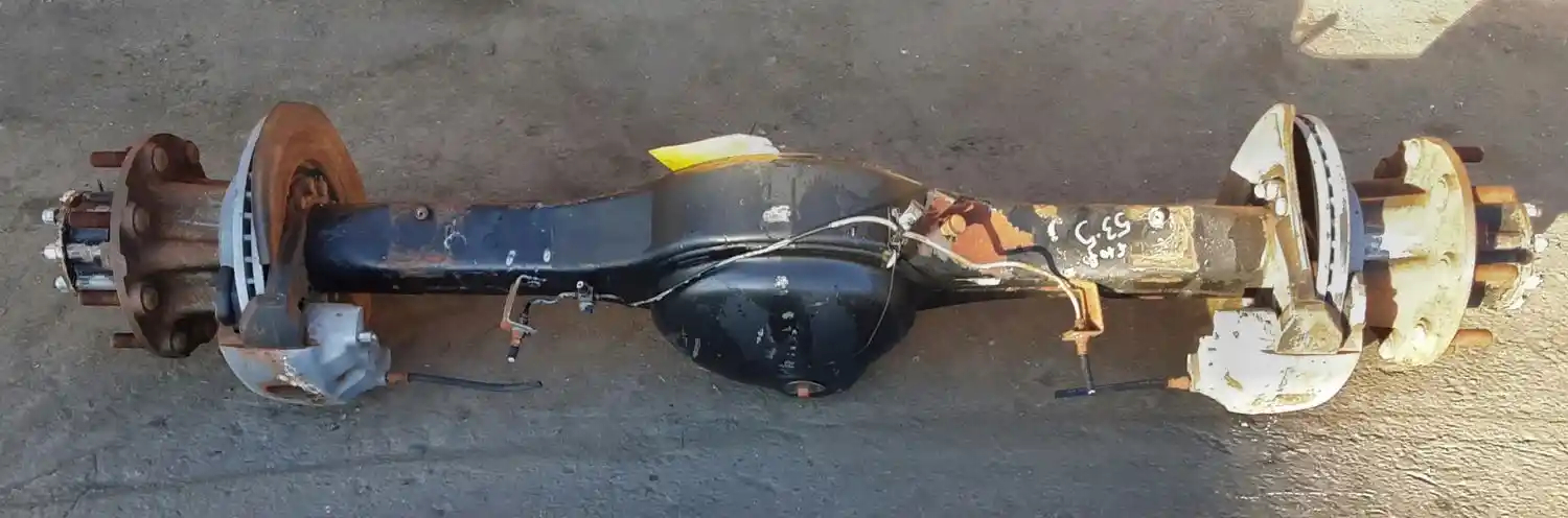 Used: Used Spicer Rear Axle Housing, S150S, 8 Hole Pilot, Hydraulic Disc Brakes, 53.5" Inner Flange To Inner Flange, STD Track. Removed From International Spring Suspension. HOUSING ONLY, DIFF SOLD SEPARATELY.