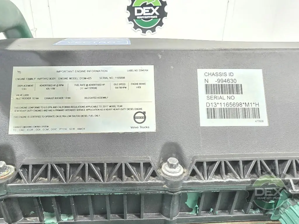 Recycled: Recycled '17 Volvo D13M, US17, complete engine, serial 1165698 rated at 425 hp, with ebrake, (running at time of dismantle, 12/1/25)) was paired with Ishift trans, out of '17 VN with 292k miles, No core charge ! Core p/n 85027393