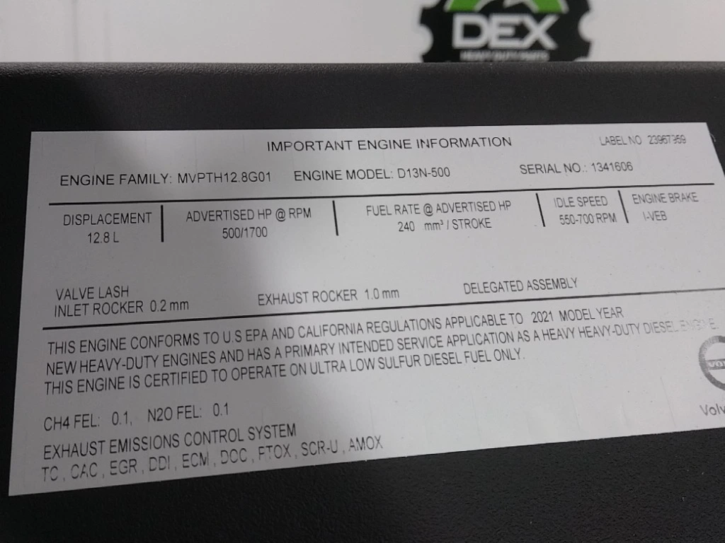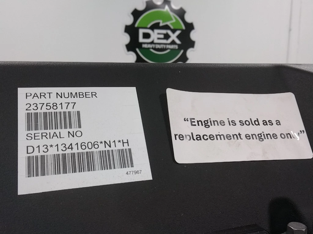 Surplus A: Surplus A New, never installed complete Volvo D13N US21 engine, OBD20 / OBD21, "Spare part engine", Engine is sold as a replacement engine only and should be used for replacement of like engine, EBR-VEB7, engine family LVPTH12.8G01, serial 1341606, CS43B-O, EXCH: 85022807 BASE: 85022811, Engine is new and was never installed in a chassis, core p/n 85028807