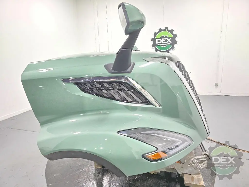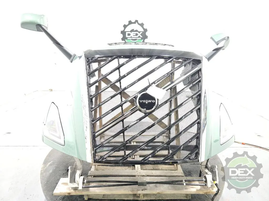 Recycled: Recycled '25 Volvo VNL hood assembly with piano black grille, headlights, vents, heated spot mirrors, etc..., grille 24470849, side grilles 24499777 and 24499862, 24655526, headlights 24671785 and 24671786, mirrors 78563533 and 78568865, etc... Painted Prarie grass LA P0280