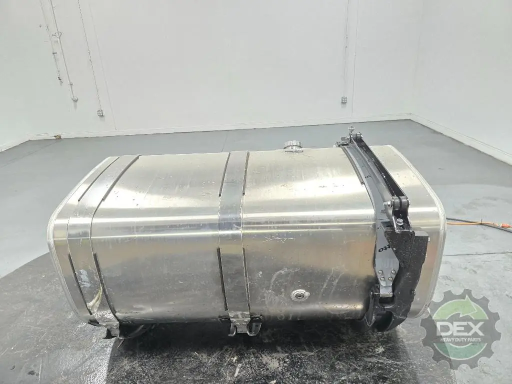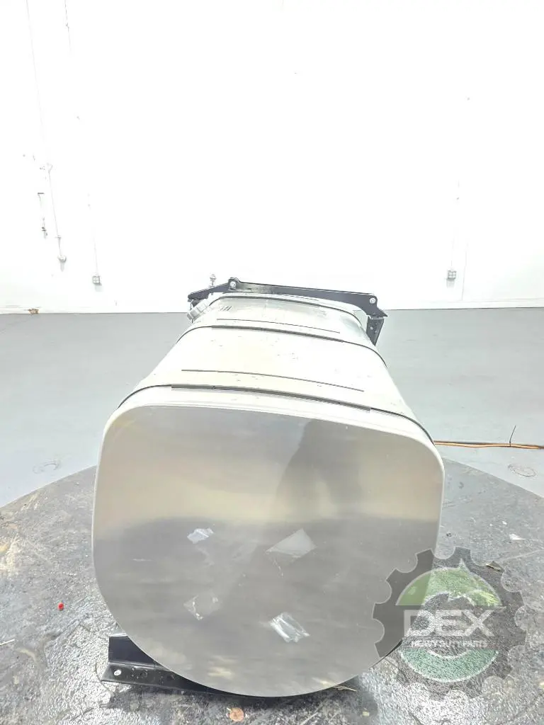 Recycled: Recycled Volvo RH 125 gallon D shaped aluminum fuel tank, 26" dia x 50" long with straps and brackets, front fill neck