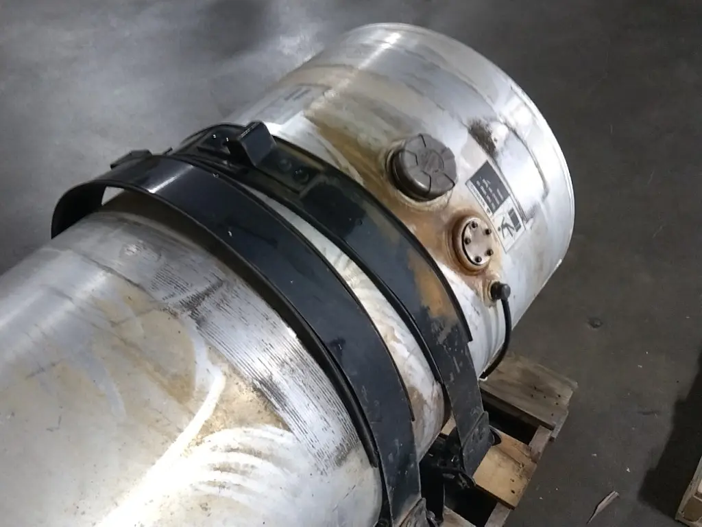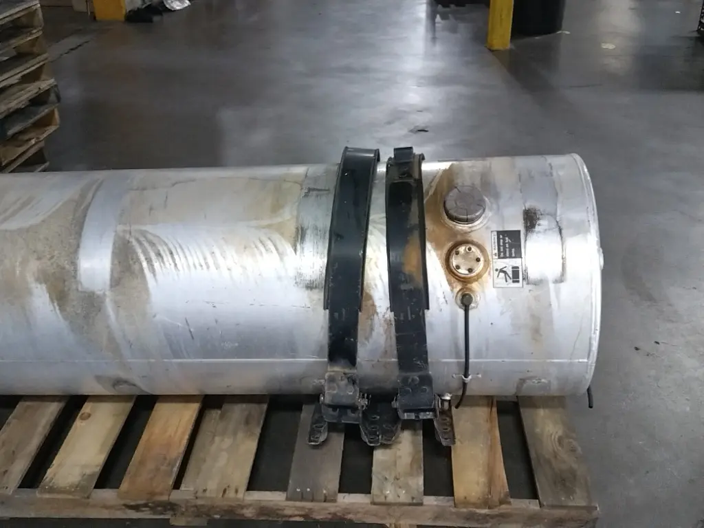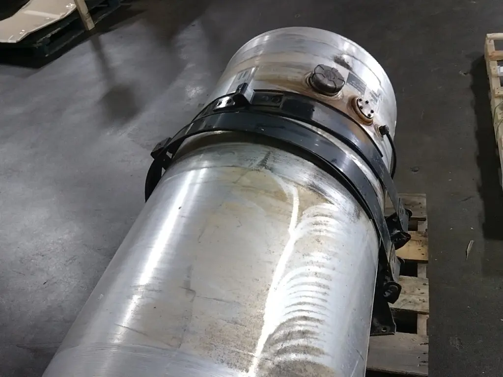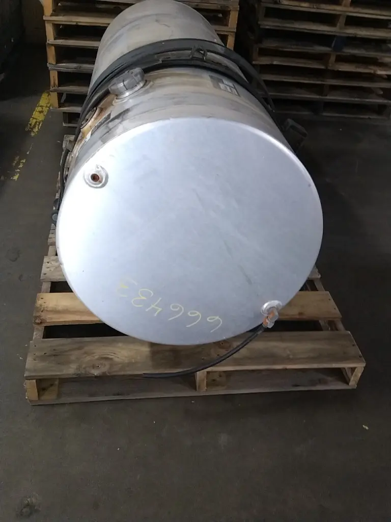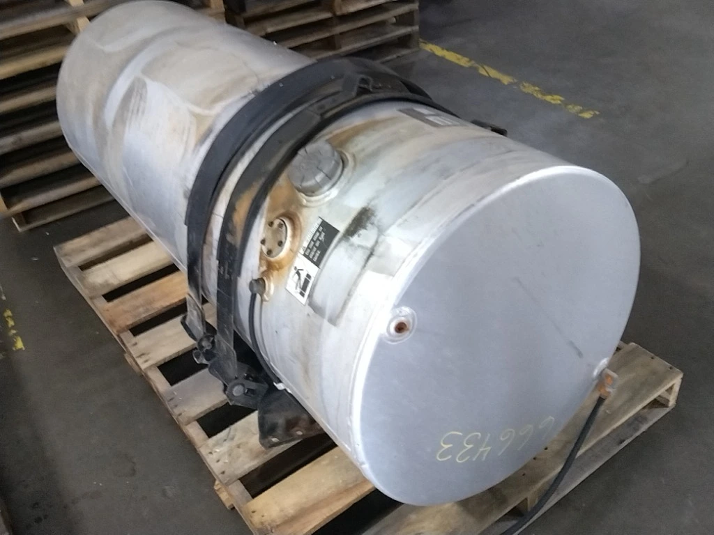 Recycled: Recycled 150 gallon aluminum fuel tank, 26" dia x 69" long with rear fill neck, straps and brackets