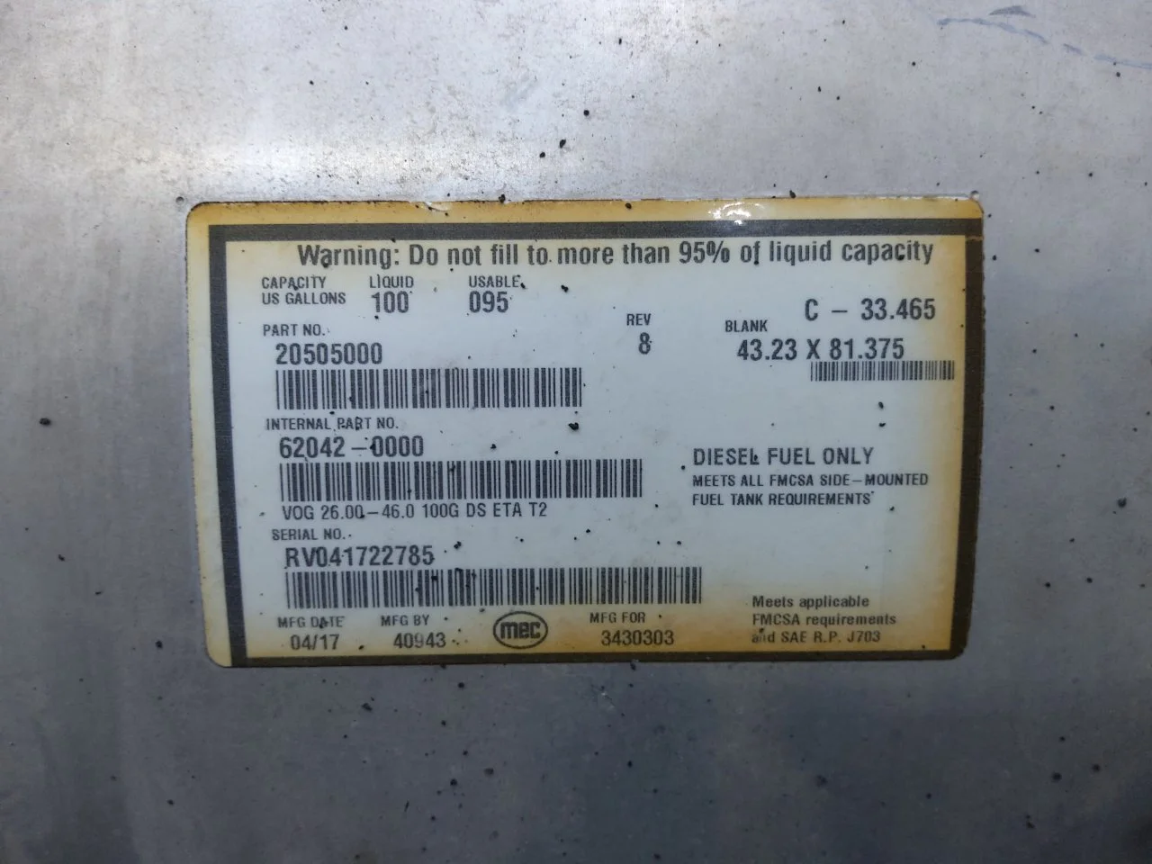USED: USED 100 GAL ALUMINUM TANK ONLY, 10" FTF