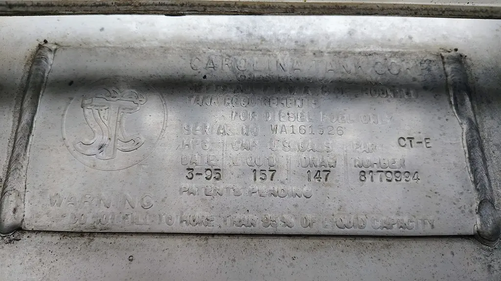 1995 Volvo WIA Driver Side Fuel Tank. 67.5" x 26", 157 Gallon Capacity, w/ Straps & Brackets. P/N 8179994.