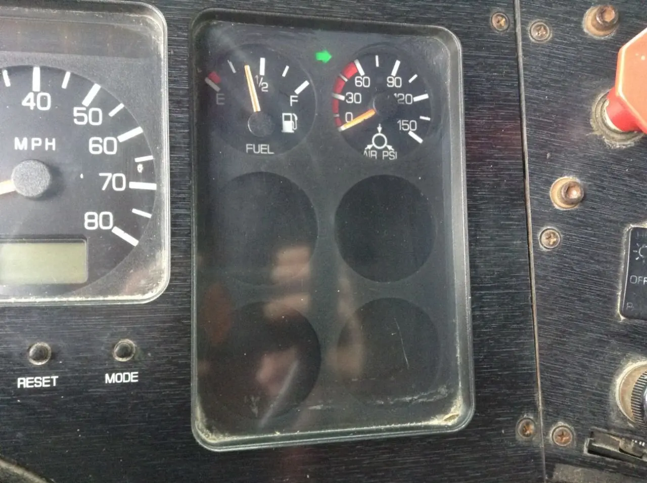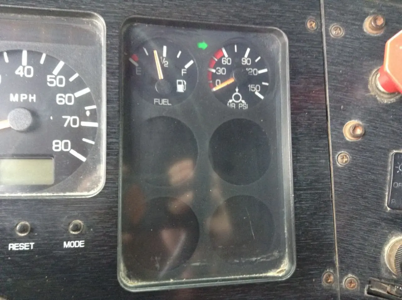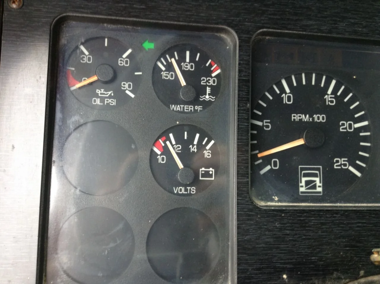 USED: USED 7 ANALOG GAUGES W/ DIGITAL MILES & BLACK WOODGRAIN, OIL PSI, WATER TEMP, VOLTS, RPM, MPH, FUEL, AIR PSI, 7 BLANKS