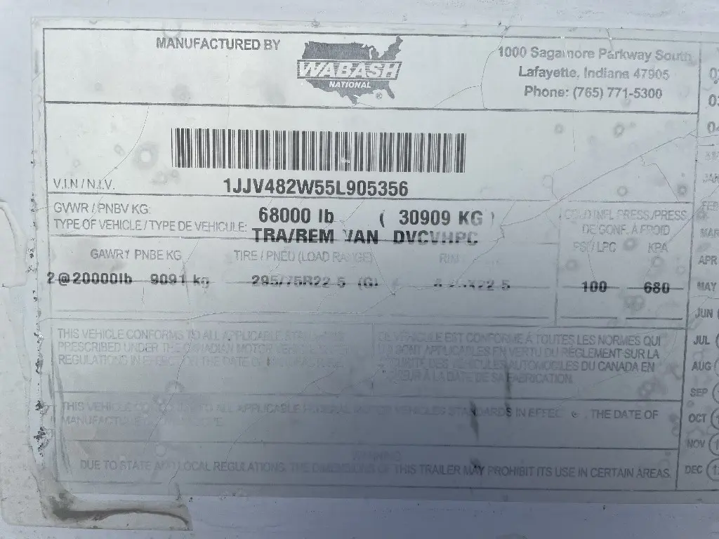 This item is from a WABASH 48' x 102" T/A VN TLR RRD.
