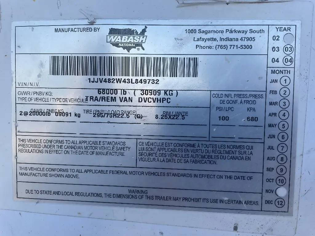 This item is from a WABASH 48' x 102" T/A VN TLR RRD.