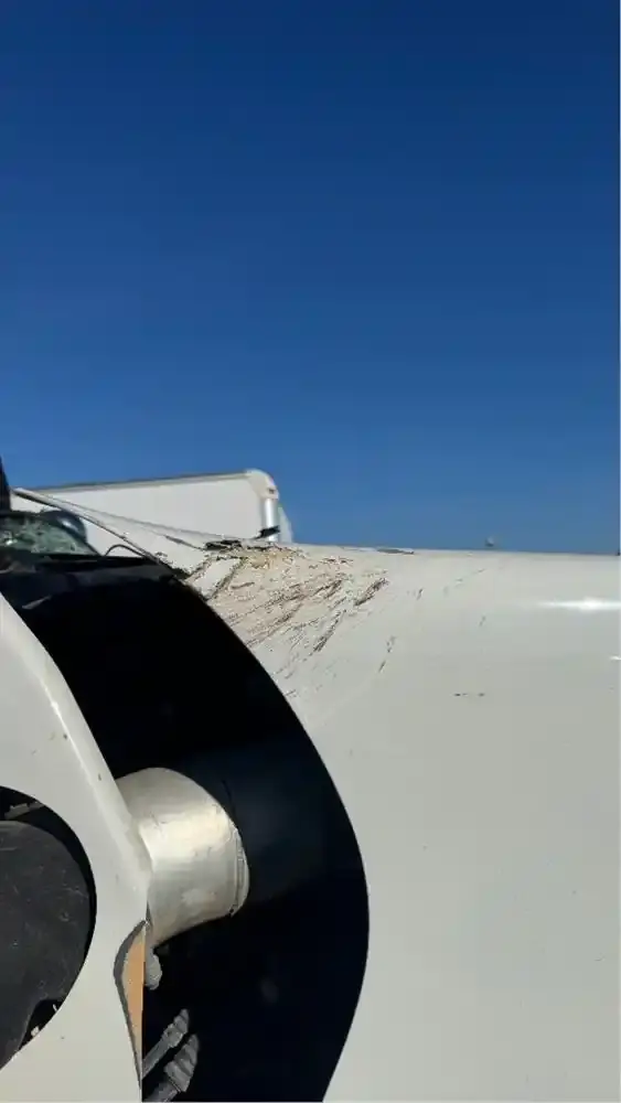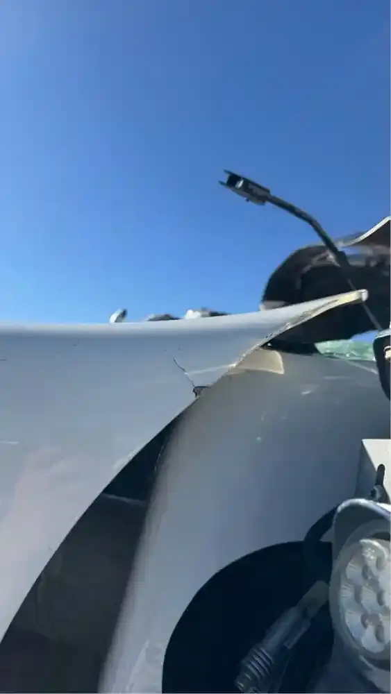USED COMPLETE HOOD HAS DAMAGE ON TOP, FIBERGLASS IS BENT UP, REPAIRABLE